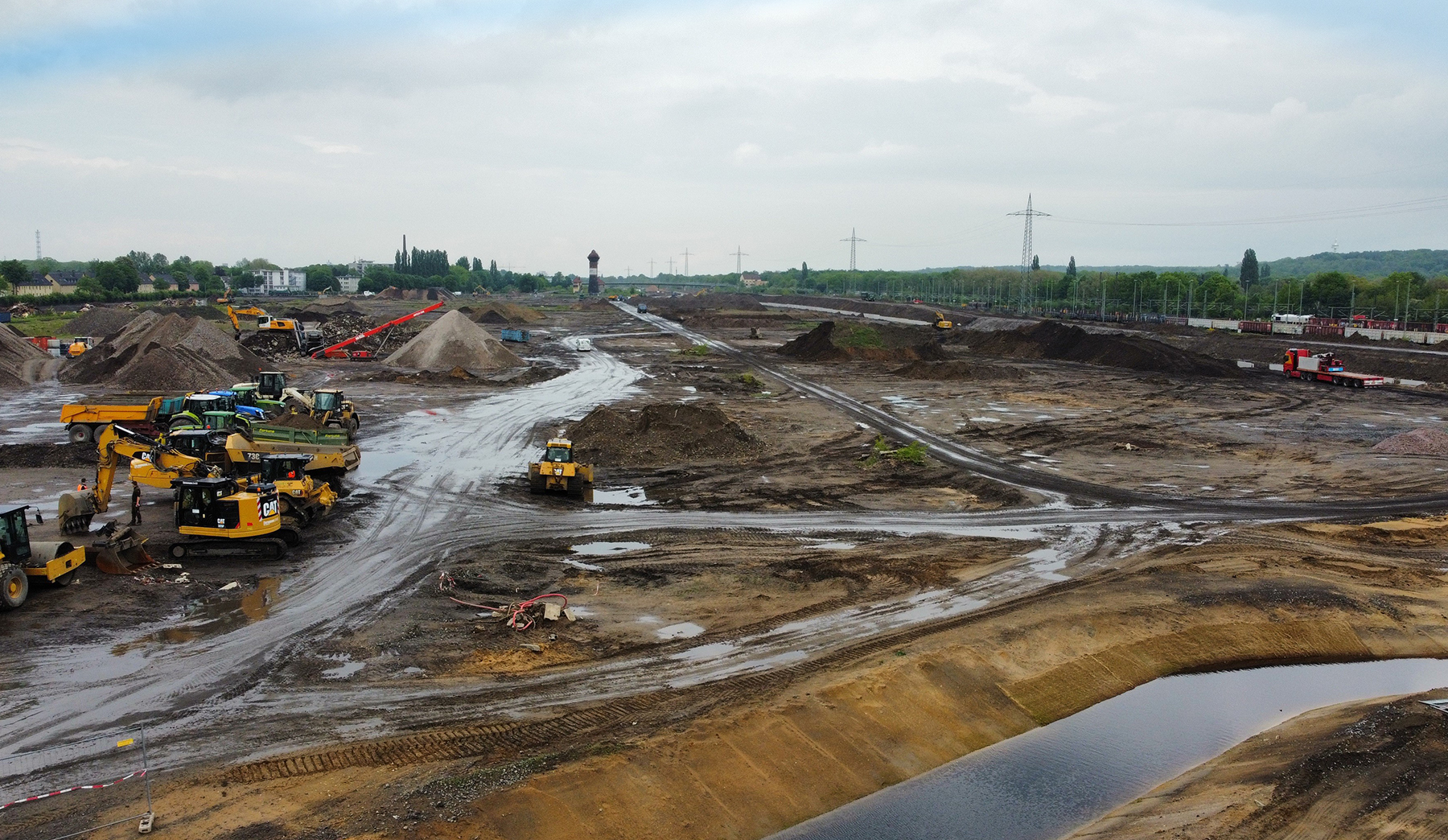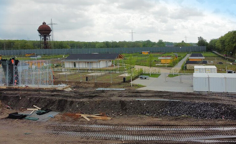 Die Ausführung der hier anstehenden Erschließungsarbeiten ist in zwei Schritten vorgesehen: Das erste Leistungspaket des Generalunternehmers umfasst das anstehende Bodenmanagement bzw. die Bodensanierung, die Errichtung der Lärmschutzanlage sowie den Neubau einer Kleingartenanlage.
